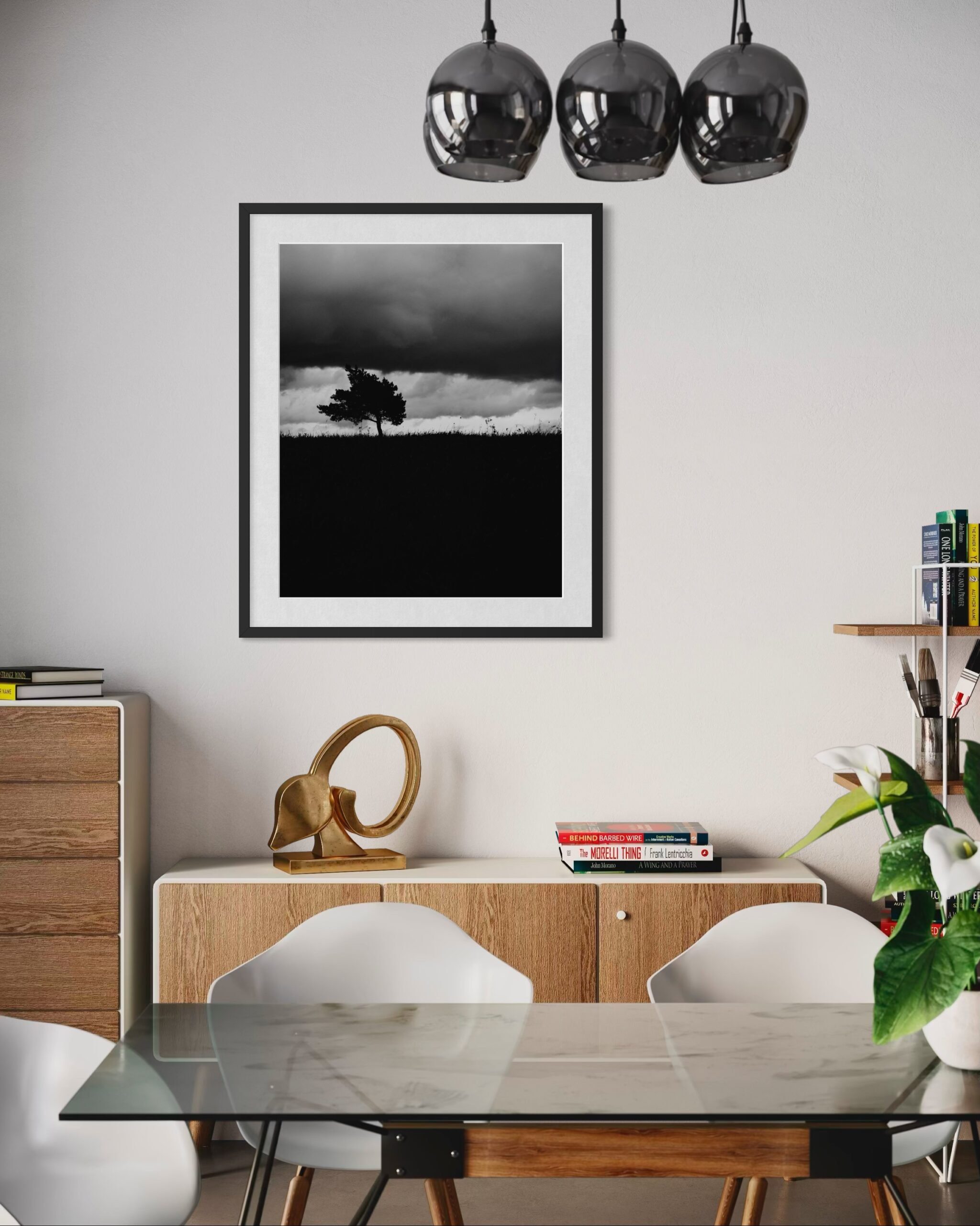 - Printai rėminami į medinius juodos spalvos rėmelius, printą paklijuojant ant kieto popieriaus tam, kad šis nesibanguotų.